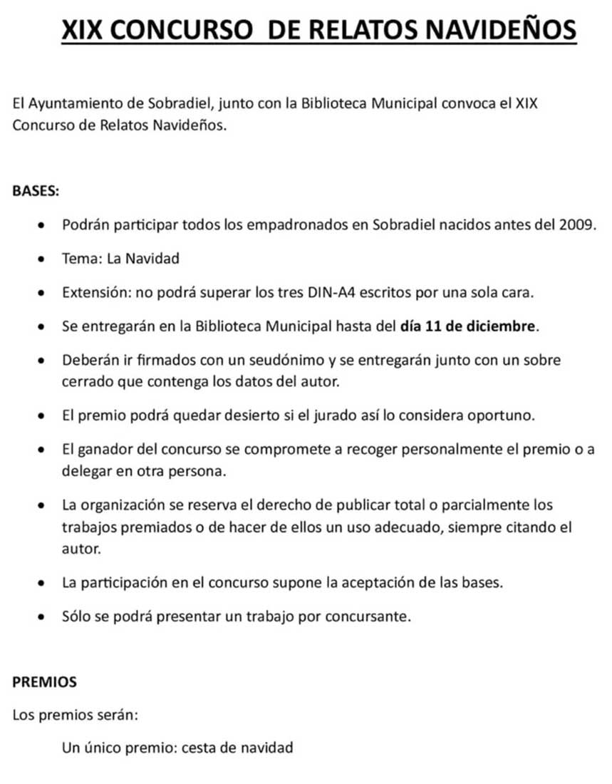 El Ayuntamiento de Sobradiel y la Biblioteca Municipal convocan una nueva edición del tradicional concurso de relatos navideños