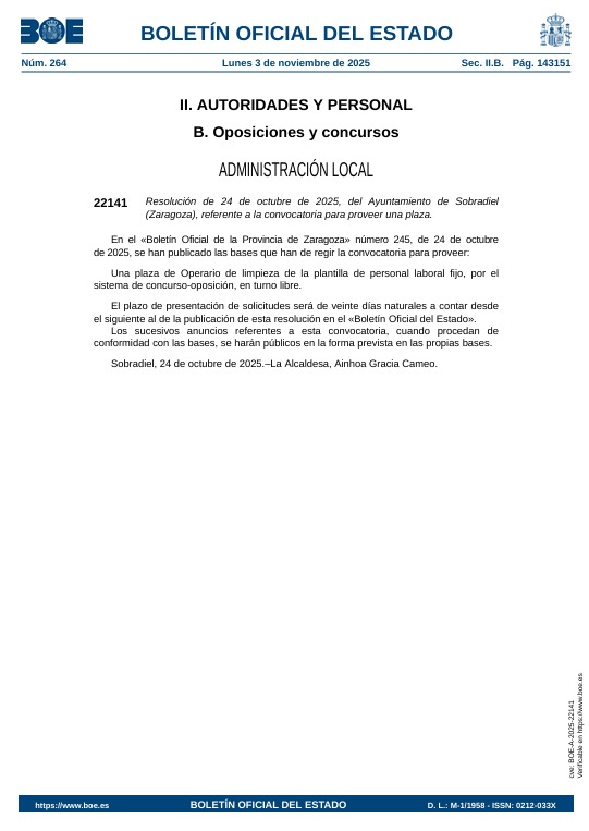 Ya se ha publicado oficialmente en el Boletín Oficial del Estado (BOE) la convocatoria para cubrir una plaza de operario/a de limpieza del Ayuntamiento de Sobradiel.